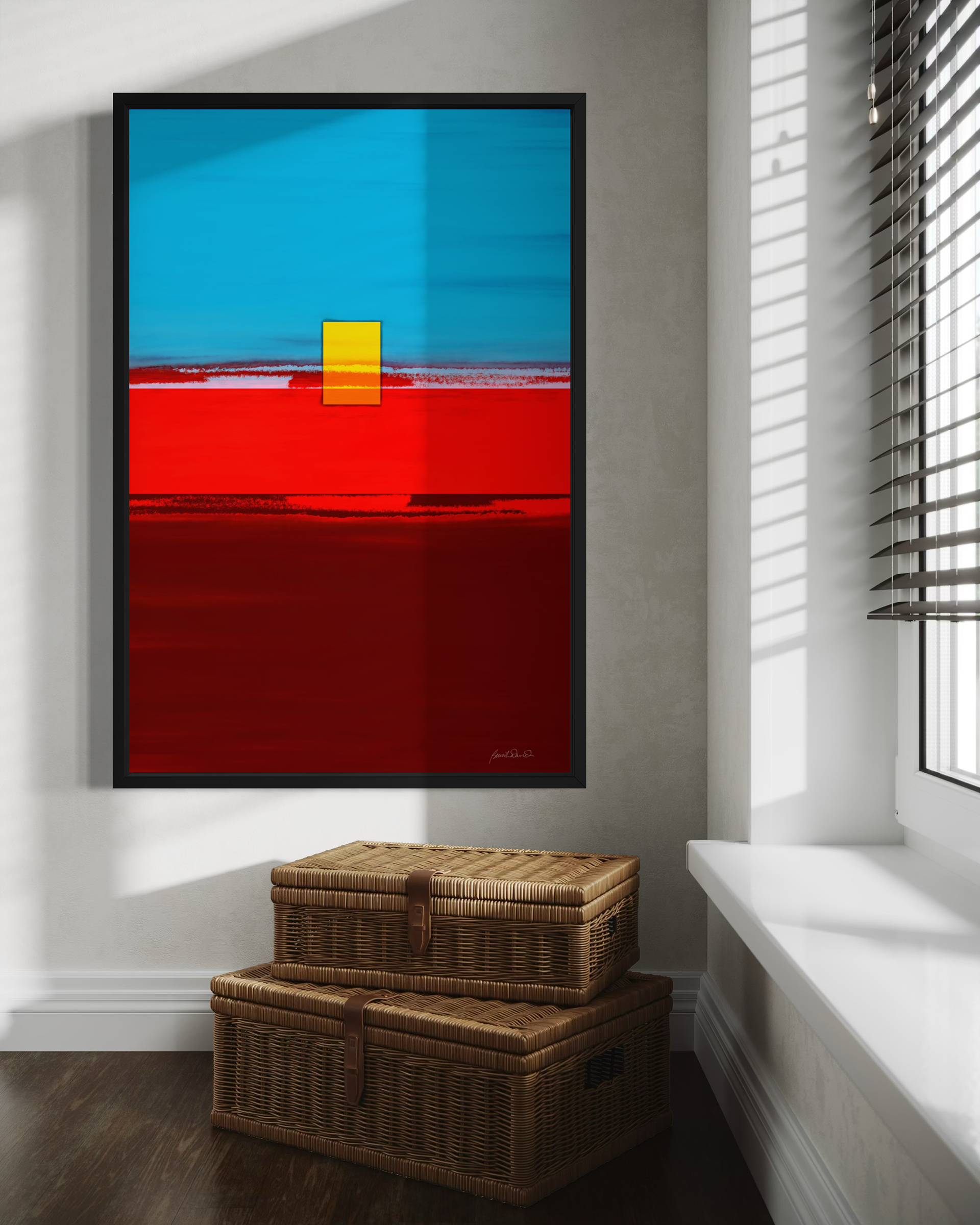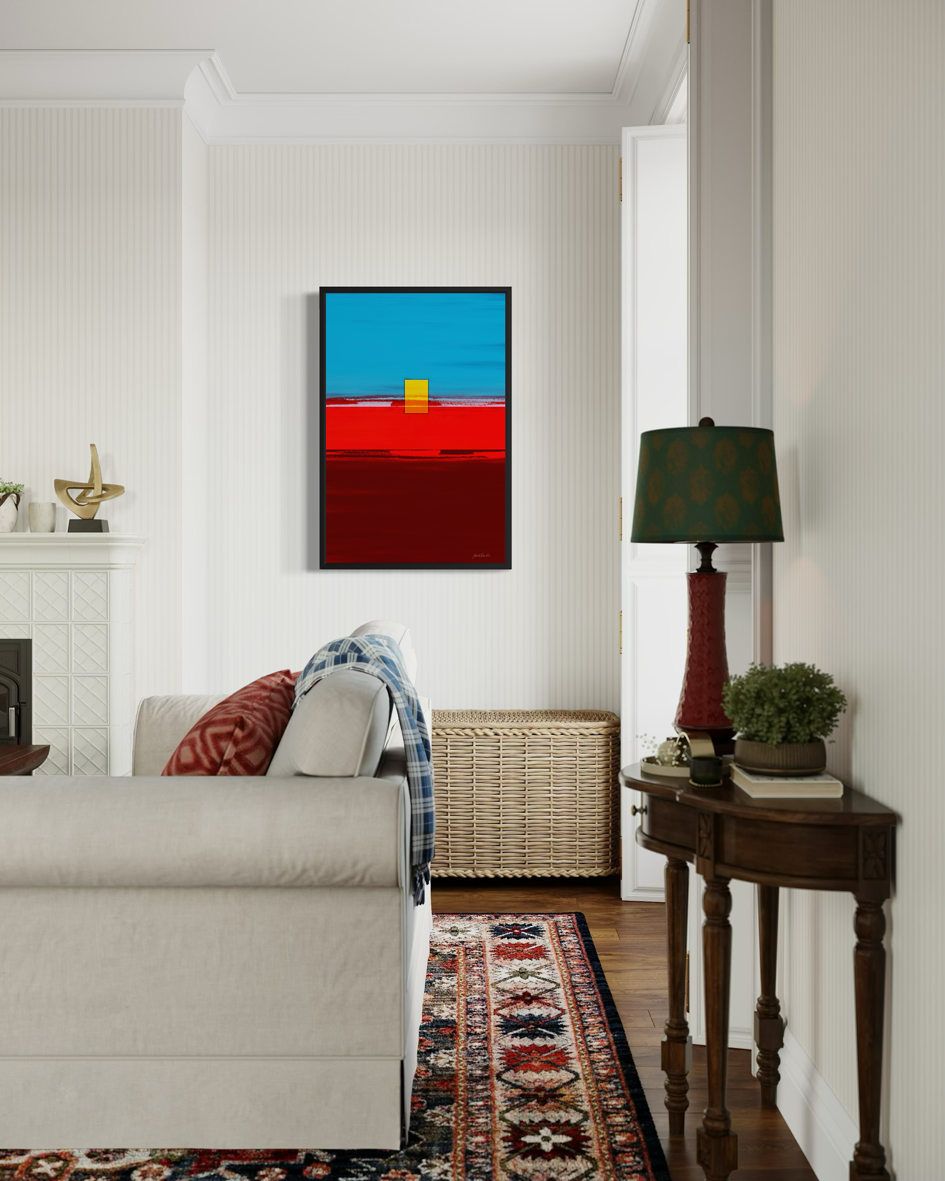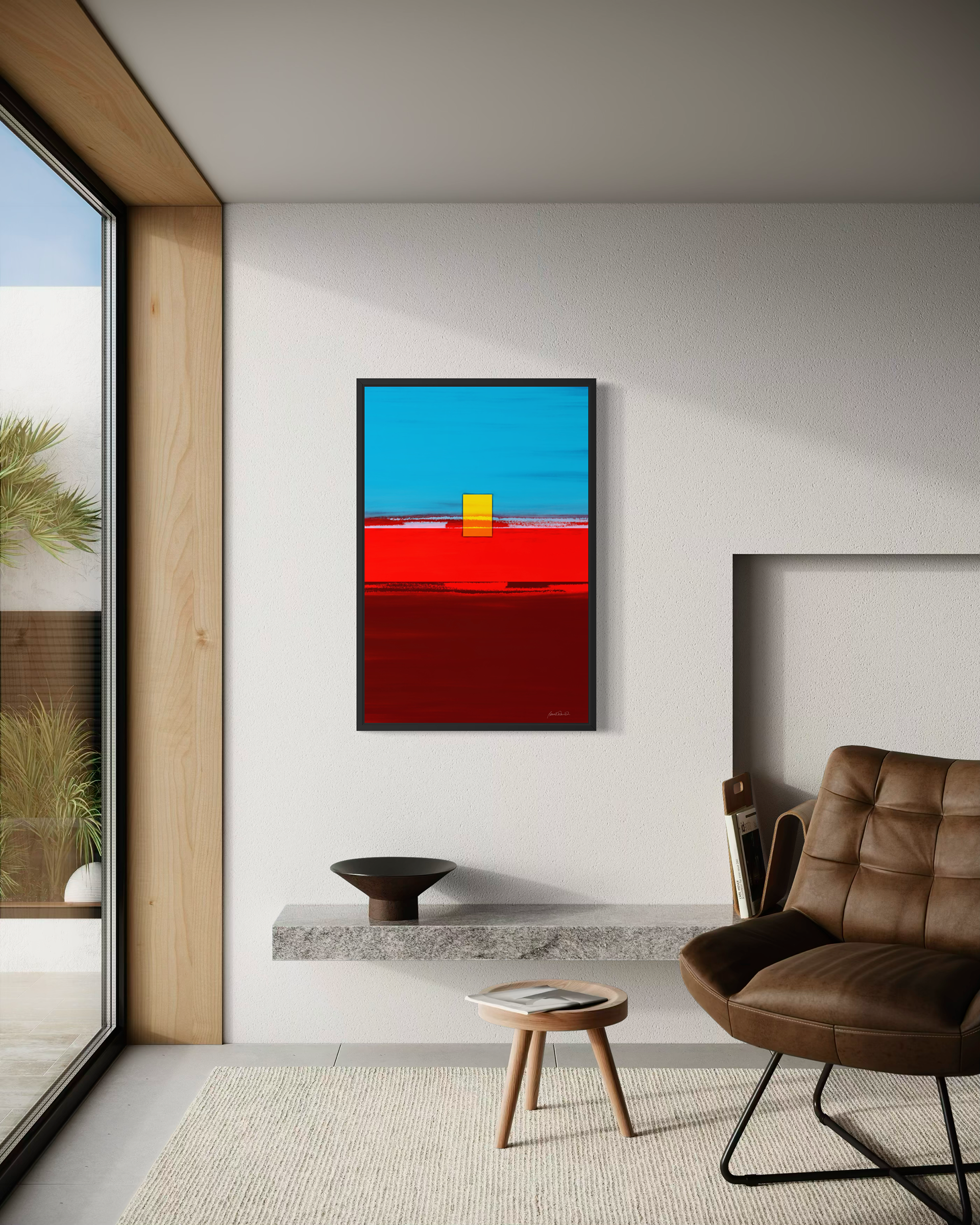 This work presents a vivid horizon where a solitary yellow rectangle rises from a sea of crimson and deep red, set beneath a vast expanse of serene blue. The contrast of warmth and coolness evokes a quiet tension, as if a hidden light flickers between land and sky. It reveals a moment suspended in color and form, inviting contemplation. This piece would bring a striking balance of calm and energy to your space.