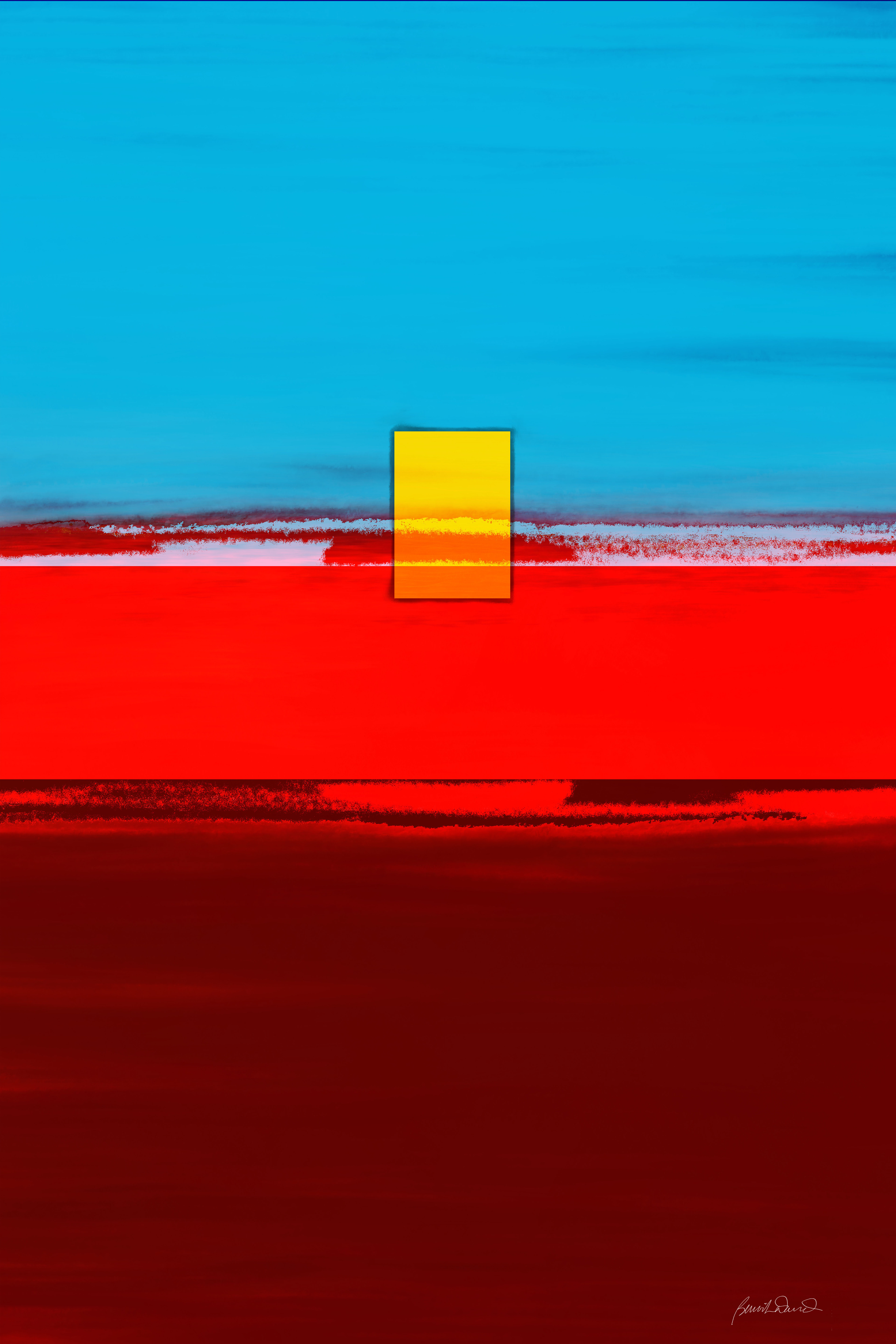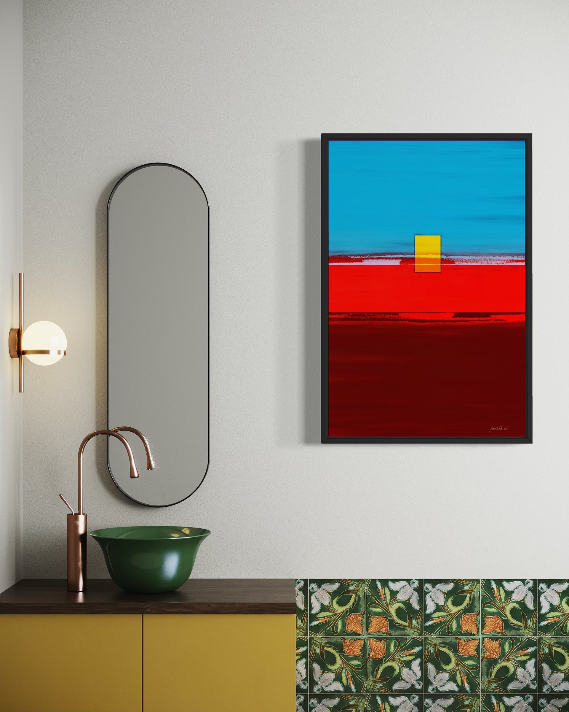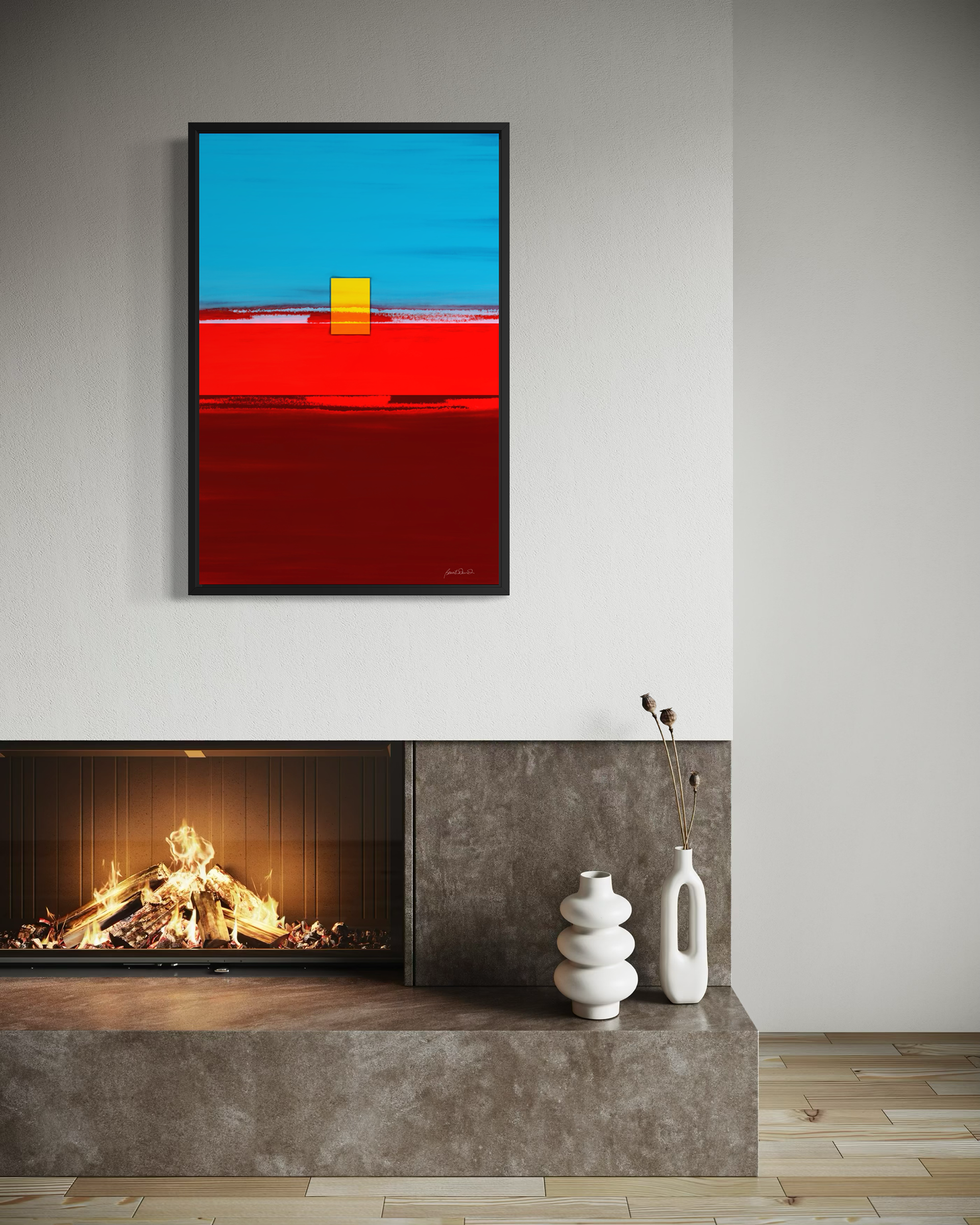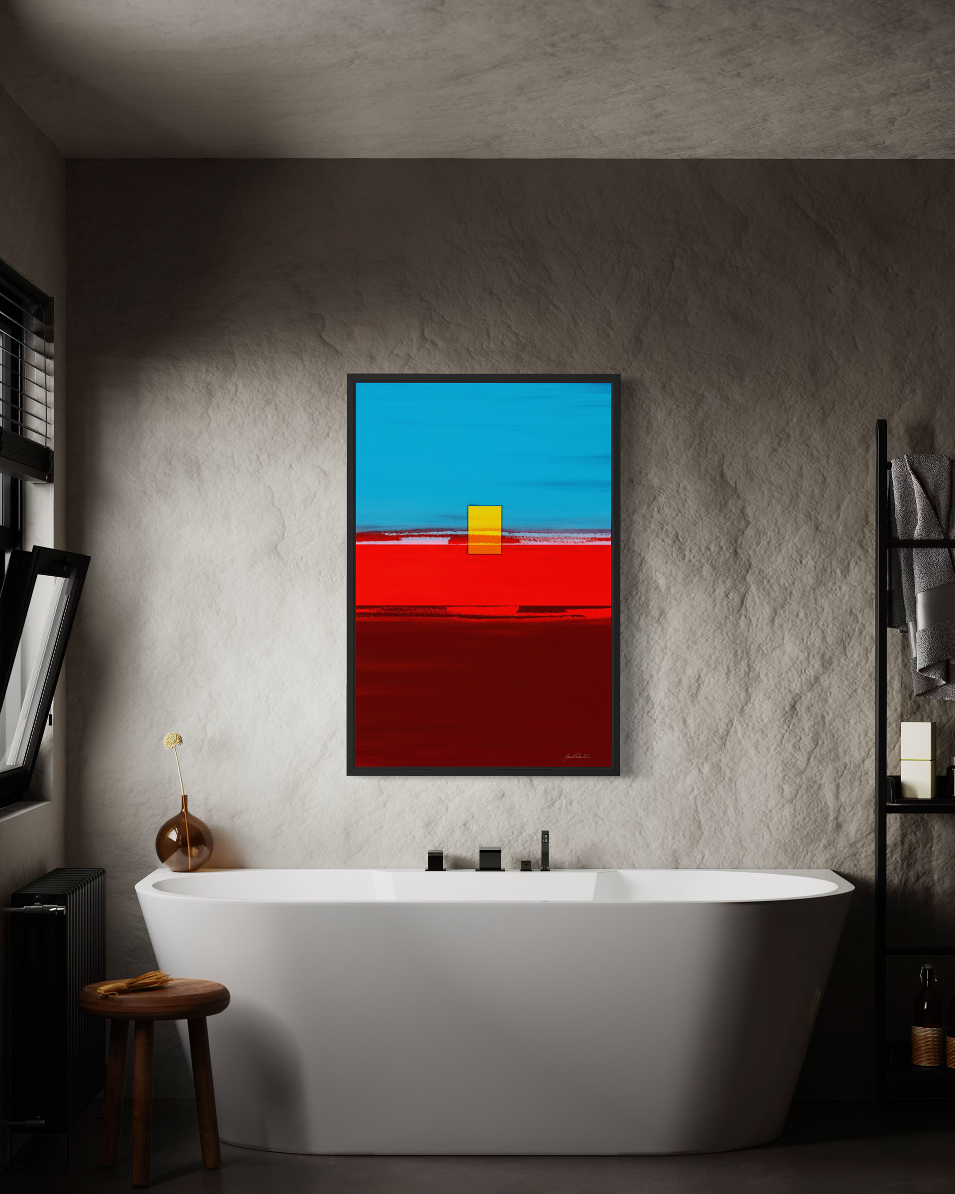 This work presents a vivid horizon where a solitary yellow rectangle rises from a sea of crimson and deep red, set beneath a vast expanse of serene blue. The contrast of warmth and coolness evokes a quiet tension, as if a hidden light flickers between land and sky. It reveals a moment suspended in color and form, inviting contemplation. This piece would bring a striking balance of calm and energy to your space.