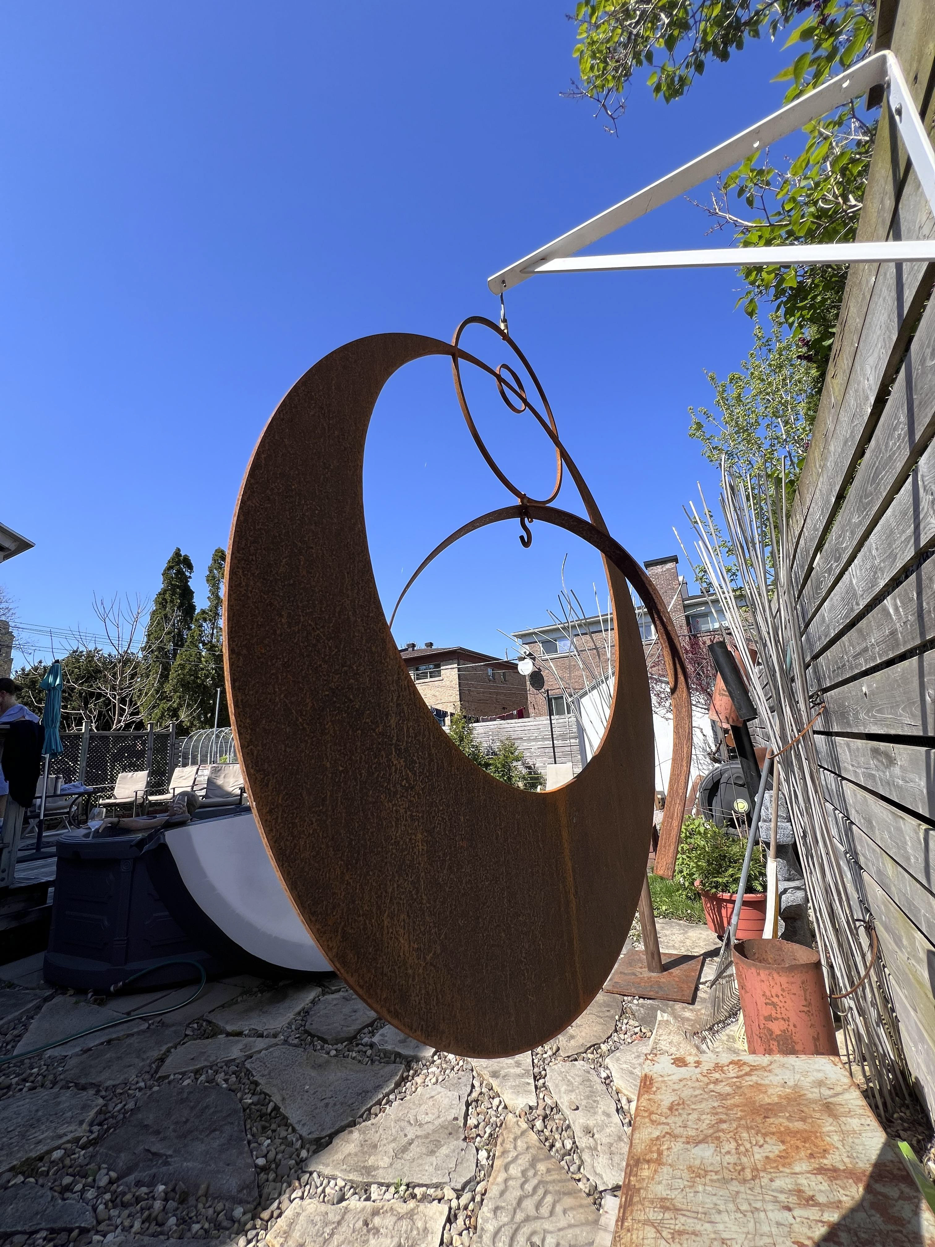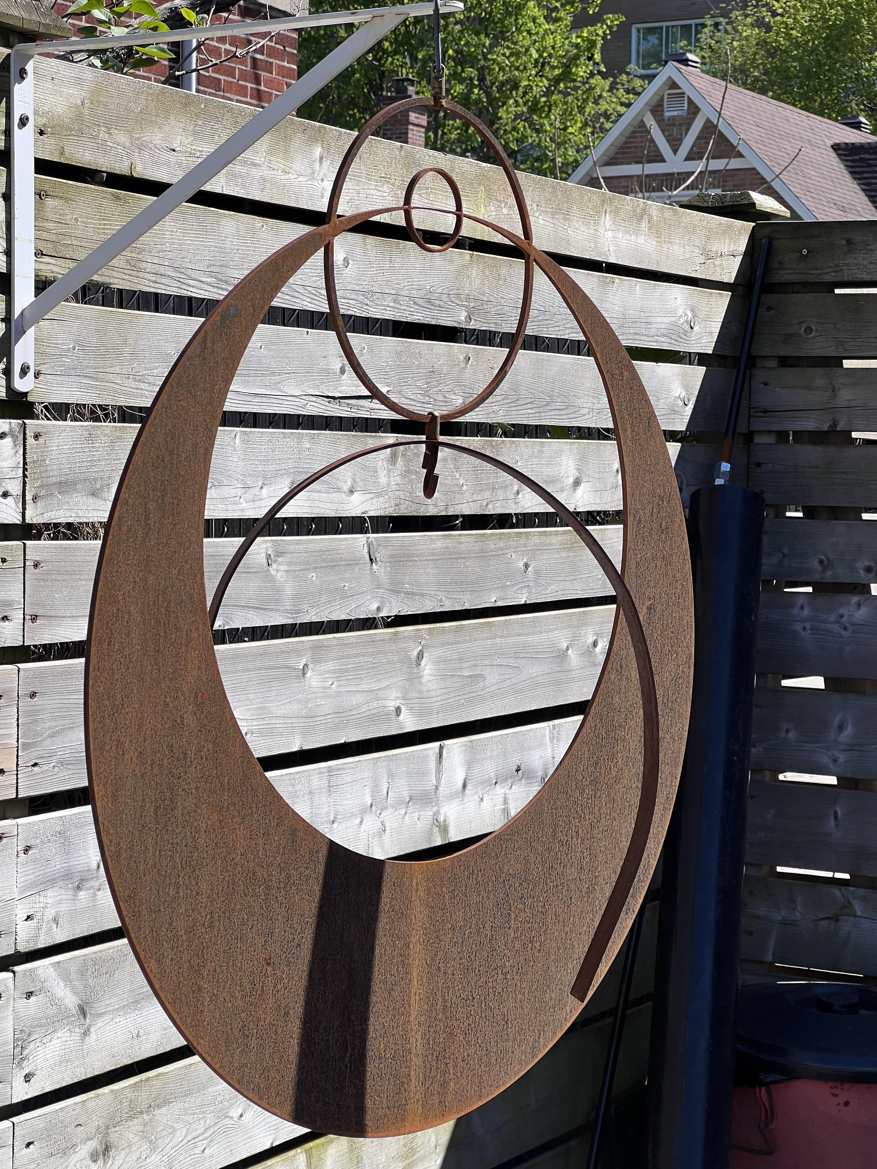 Made of weathered steel, this suspended sculpture presents concentric rings that orbit in gentle balance. The rusted patina—warm ochre to iron-brown—records seasons and touch, turning flat planes into textured fields of light and shadow. Hung from a single point, the elements pivot subtly with breeze and sun, casting changing silhouettes against fence or wall. Clean geometry and honest material combine to express quiet movement and grounded presence. A considered sculptural piece that will quietly enrich your garden, patio, or courtyard.